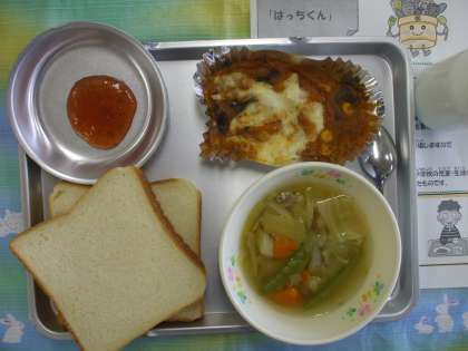 5月8日(木) 今日の給食 公開日 2014/05/08 更新日 2014/05/08 給食室から ジャムサンド(セルフ) はっち君グラタン キャベツとベーコンのスープ 牛乳 ☆☆☆ 野菜の産地 ☆☆☆ じゃが芋 長崎 たまねぎ 佐賀 人参 静岡 ピーマン 茨城 ほうれん草 八王子 キャベツ 熊本 絹さや 伊豆 給食