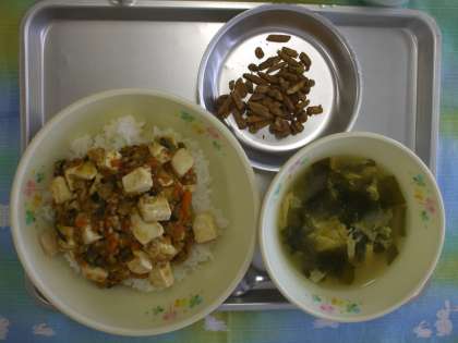5月9日(金) 今日の給食 公開日 2014/05/09 更新日 2014/05/09 給食室から マーボー丼 若玉スープ 黒糖ナッツ 牛乳 ☆☆☆ 野菜の産地 ☆☆☆ 人参 静岡 長ネギ 千葉 にら 栃木 生姜 熊本 にんにく 青森 卵 青森 玉ねぎ 佐賀 給食