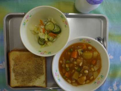 5月13日(火) 今日の給食 公開日 2014/05/13 更新日 2014/05/13 給食室から セサミトースト ポークビーンズ フレンチサラダ 牛乳 ☆☆☆ 野菜の産地 ☆☆☆ じゃが芋 長崎 玉ねぎ 千葉 人参 静岡 マッシュルーム 千葉 キャベツ 神奈川 きゅうり 栃木 給食