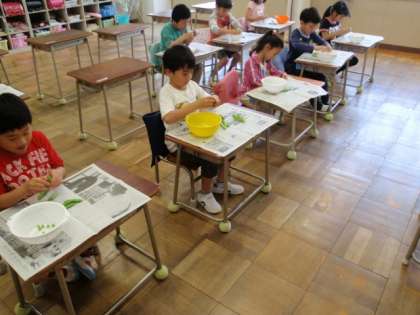 今日は、グリンピースのさやむき作業をしました。「給食室から頼まれた仕事だよ。」と話すと、張り切る子供たち。