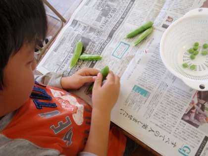 どの子も真剣に作業をしていて、おしゃべりも聞こえてこなくなりました。たくさんのグリンピースが、ざるに入れてある様子を見て、「すごいね!頑張ったね。」と振り返りました。