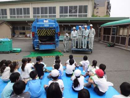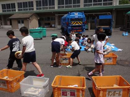ごみの投入・分別体験 公開日 2014/05/19 更新日 2014/05/19 4年生 5月13日、南大沢清掃事業所のみなさんによるごみの出張授業がありました。投入体験では、本物のごみ収集車にごみを投入しました。分別体験では、さまざまなごみを班ごとに分ける作業を通して、ごみの捨て方を勉強しました。 4年