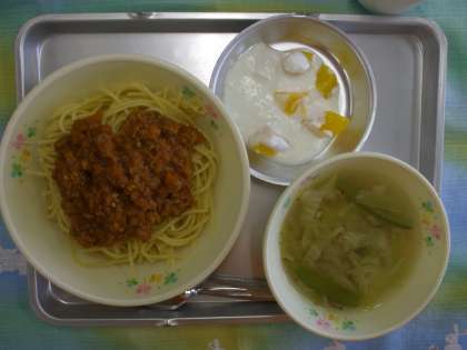 5月20日(火) 今日の給食 公開日 2014/05/20 更新日 2014/05/20 給食室から スパゲッティミートソース 野菜スープ ピーチヨーグルト 牛乳 ☆☆☆ 野菜の産地 ☆☆☆ 人参 静岡 玉ねぎ 淡路島 にんにく 青森 セロリ 茨城 キャベツ 茨城 絹さや 伊豆 給食