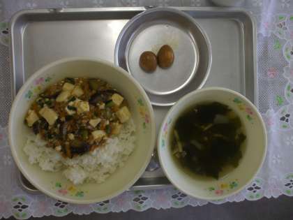 9月4日(木) 今日の給食 公開日 2014/09/04 更新日 2014/09/04 給食室から マーボーなす丼 わかめスープ 煮卵 牛乳 ☆☆☆ 野菜の産地 ☆☆☆ にんじん 北海道 にら 茨城 生姜 高知 にんにく 青森 たまねぎ 北海道 なす 八王子 長ネギ 八王子 給食