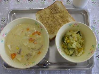 9月5日(金) 今日の給食 公開日 2014/09/05 更新日 2014/09/05 給食室から セサミトースト コーンチャウダー グリーンサラダ 牛乳 ☆☆☆ 野菜の産地 ☆☆☆ じゃが芋 北海道 にんじん 北海道 たまねぎ 北海道 きゅうり 岩手 キャベツ 群馬 給食