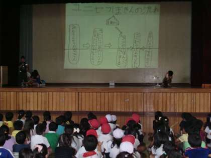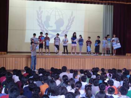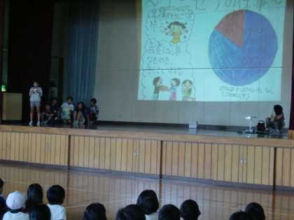9月16日(火)朝。代表委員会によるユニセフ集会が開かれました。ユニセフの活動紹介や募金の意義などを、代表委員の児童が作った資料を映しながら、わかりやすく説明して、募金を呼びかけました。