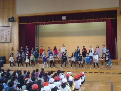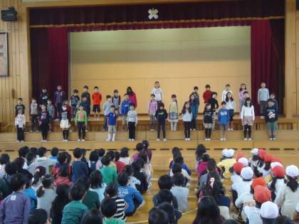 今朝の集会は3年生の音読発表でした。原作:北原白秋、家本芳郎:編、「まつりだ わっしょい」をみんなで群読しました。緊張していた様子でしたが、大きな声で発表をしました。