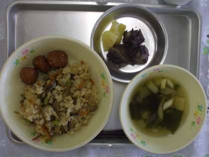12月10日(水) 今日の給食 公開日 2014/12/10 更新日 2014/12/10 給食室から 五目ごはん すまし汁 揚げボールの甘辛煮 フルーツ白玉あずき 牛乳 ☆☆☆ 野菜の産地 ☆☆☆ ながねぎ 八王子 にんじん 千葉 ごぼう 青森 しめじ 長野 給食