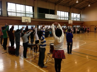 音楽委員からのあいさつに続き、まずは元気な声を出すために全員で準備体操。そして上級生によるお手本の歌の後、全員での合唱をしました。
