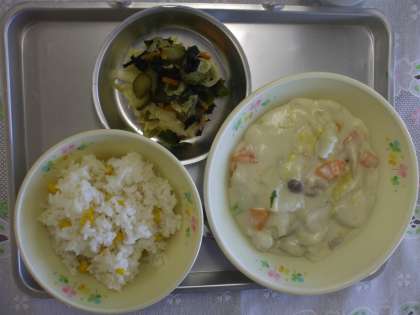 12月19日(金) 今日の給食 公開日 2015/01/20 更新日 2015/01/20 給食室から コーンライス 冬野菜のシチュー わかめサラダ 牛乳 ☆☆☆ 野菜の産地 ☆☆☆ たまねぎ 北海道 里芋 埼玉 人参 千葉 白菜 茨城 しめじ 長野 キャベツ 茨城 きゅうり 千葉 人参 千葉 かぶ 八王子 給食