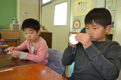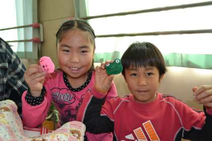 ちくちく毛糸やさんでは2枚のフェルトを針と糸で縫い、中に綿を入れてマスコットを作りました。針を使うので緊張しながら真剣に取り組んでいました。出来上がったマスコットを「ランドセルにつけたいなー」と一人一人がお気に入りのものを作れたようでよかったです。