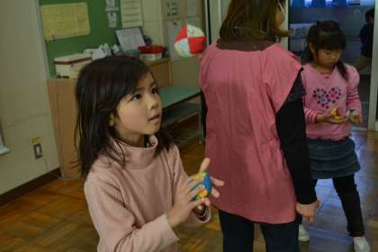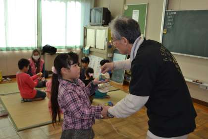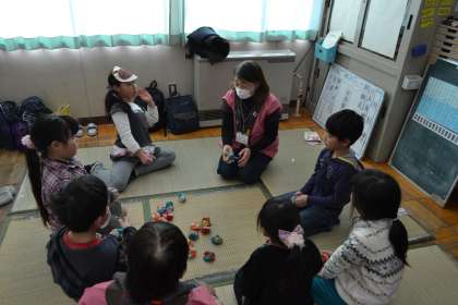 むかしあそびには地域の「お手玉の会」の方々にご協力をいただきました。お手玉やけん玉などのコツを教えていただき、子供たちも見る見る上達していくことが分かりました。お手玉を上げるタイミングやひざの使い方など、うまくなるためのコツを具体的に指導をしていただきました。
