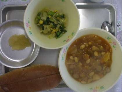 2月18日(水) 今日の給食 公開日 2015/02/18 更新日 2015/02/18 給食室から 手作りりんごジャムサンド(セルフ) 小松菜とコーンのサラダ ウインナーと豆のトマト煮 牛乳 ☆☆☆ 野菜の産地 ☆☆☆ リンゴ 青森 玉ねぎ 北海道 人参 千葉 エリンギ 新潟 キャベツ 熊本 小松菜 八王子 レモン 佐賀 じゃが芋 八王子 給食