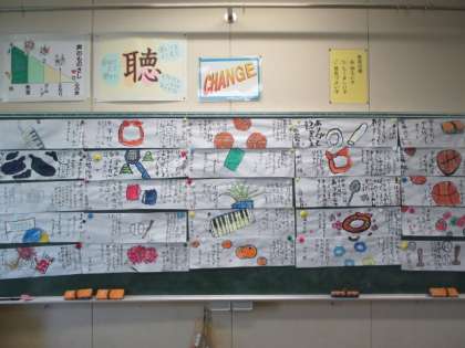 絵手紙教室 公開日 2015/02/19 更新日 2015/02/19 5年生 2月12日・19日の2回に渡り、絵手紙教室の講師の先生に、絵手紙のかき方を教えていただきました。卒業する6年生に向けて、相手をイメージした絵とメッセージをかきました。普段の習字と違い、小筆の上の方を持って書くことや、絵具で色をつけるときに塗りつぶさないことなど、絵手紙の特徴を楽しみながら、集中してかいていました。一人一人の素敵な絵手紙で、6年生に感謝の気持ちが伝わるとよいです。 5年