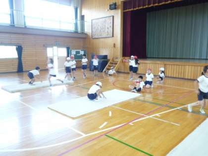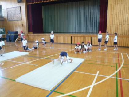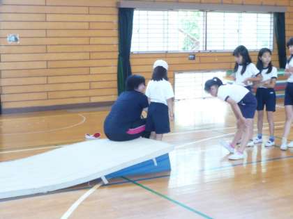 マット運動をしています 公開日 2015/06/05 更新日 2015/06/05 4年生 運動会が終わり、体育ではマット運動がはじまりました。 マット運動では、回転技と倒立技それぞれに挑戦しています。 後転の練習では、坂道を使ったり、友達と教えあったりし、工夫して練習をしていました。