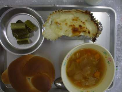 6月5日(金) 今日の給食 公開日 2015/06/05 更新日 2015/06/05 給食室から ミルクパン マカロニグラタン ミネストローネ フレンチきゅうり 牛乳 ☆☆☆ 野菜の産地 ☆☆☆ たまねぎ 埼玉 エリンギ 新潟 にんじん 千葉 キャベツ 茨城 セロリ 長野 にんにく 青森 きゅうり 茨城 給食