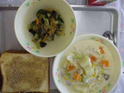 6月10日(水) 今日の給食 公開日 2015/06/10 更新日 2015/06/10 給食室から セサミトースト クリームシチュー わかめサラダ リンゴジュース ☆☆☆ 野菜の産地 ☆☆☆ じゃがいも 千葉 にんじん 千葉 たまねぎ 香川 マッシュルーム 千葉 キャベツ 千葉 きゅうり 岩手 給食