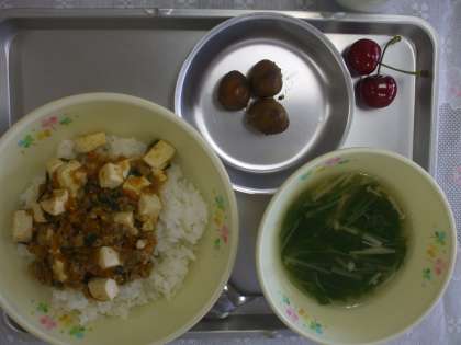 6月12日(金) 今日の給食 公開日 2015/06/12 更新日 2015/06/12 給食室から しょうゆマーボー豆腐どん 水菜のスープ うずら卵のカレー煮 くだもの 牛乳 ☆☆☆ 野菜の産地 ☆☆☆ にんじん 茨城 ねぎ 茨城 にら 茨城 みずな 茨城 えのき 長野 さくらんぼ 山形 給食