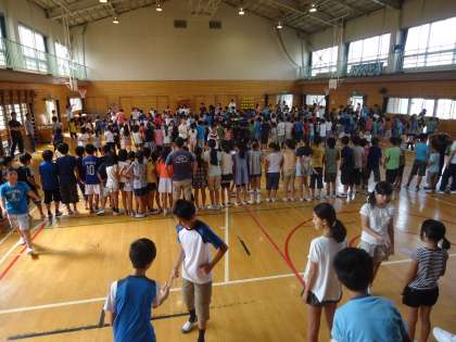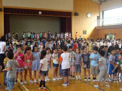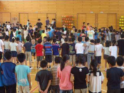 今日の児童集会は、「じゃんけんに勝って前へ進んでけゲーム」でした。1回戦は1・3・5年生がそれそれ列を作り、2・4・とちのみ・6年生が各列とじゃんけんをして勝てば次の列に進むことができるというゲームです。2回戦は列と進む学年が交替します。3つの列に勝つと、最後は集会委員とじゃんけんをして舞台に上がります。負けてしまうと、どれほど前に進んでいてもスタートに戻るというルールですので、一喜一憂しながら、楽しいひと時を過ごしました。舞台上の児童は満面の笑みでした。