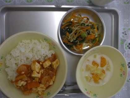 6月26日(金) 今日の給食 公開日 2015/06/26 更新日 2015/06/26 給食室から えびと豆腐のチリソース丼 3色ナムル ヨーグルトポンチ 牛乳 ☆☆☆ 野菜の産地 ☆☆☆ にんじん 千葉 ながねぎ 茨城 にんにく 青森 しょうが 高知 こまつな 神奈川 もやし 栃木 給食