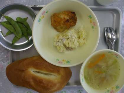 7月8日(水) 今日の給食 公開日 2015/07/08 更新日 2015/07/08 給食室から ソフトフランスパン タンドリーチキン ポテトカルボナーラ ジュリエンヌスープ 枝豆 牛乳 ☆☆☆ 野菜の産地 ☆☆☆ たまねぎ 香川 にんじん 千葉 じゃがいも 八王子 キャベツ 川口町 枝豆 横川町 給食