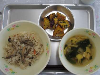 10月13日(火) 今日の給食 公開日 2015/10/13 更新日 2015/10/13 給食室から まいたけごはん 大学芋 秋の吸い物 牛乳 ☆☆☆ 野菜の産地 ☆☆☆ まいたけ 新潟 しめじ 長野 さつまいも 千葉 だいこん 北海道 こまつな 埼玉 給食