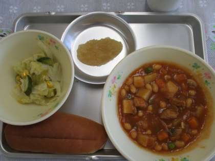 11月5日(木) 今日の給食 公開日 2015/11/05 更新日 2015/11/05 給食室から コッペパン ポークビーンズ グリーンサラダ 手作りりんごジャム 牛乳 ☆☆☆ 野菜の産地 ☆☆☆ キャベツ 八王子 にんじん 八王子 じゃがいも 八王子 たまねぎ 北海道 きゅうり 千葉 給食