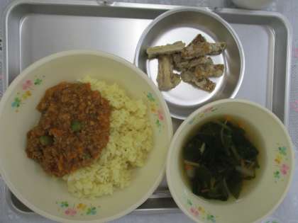11月10日(火) 今日の給食 公開日 2015/11/10 更新日 2015/11/10 給食室から ドライカレー えのきと小松菜のスープ ごぼうスティック 牛乳 ☆☆☆ 野菜の産地 ☆☆☆ えのき 長野 ごぼう 青森 にんじん 八王子 こまつな 八王子 給食