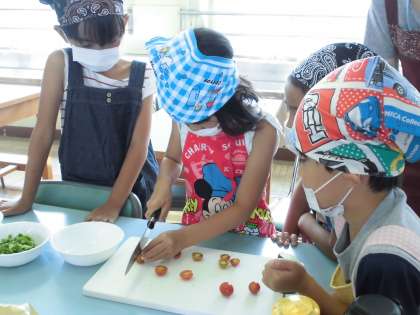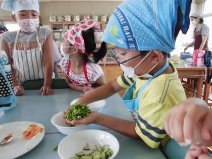 顔の形に野菜をのせたり、ピーマンを山のようにのせたりと思い思いの夏野菜ピザを作りました。「おいしいから家でも作る!」などの声も聞けたので、またお家でもチャレンジさせてあげて下さい!