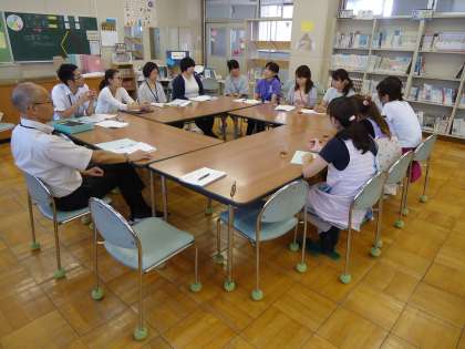 終了後は、図書室に会場を移して情報交換会を行いました。短い時間でしたが、よい話し合いができました。お忙しい中、ご来校いただいた敬愛フレンド保育園の先生方、ありがとうございました。