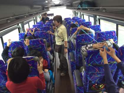 とちのみ学級宿泊学習1日目。自分たちで考えたバスレクで仲良く、楽しく目的地の西湖に向かいます。