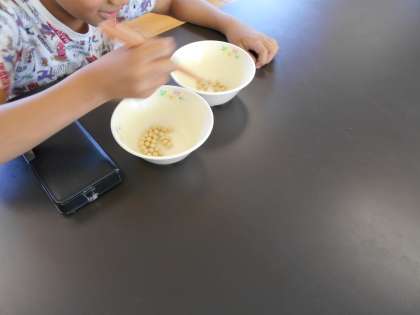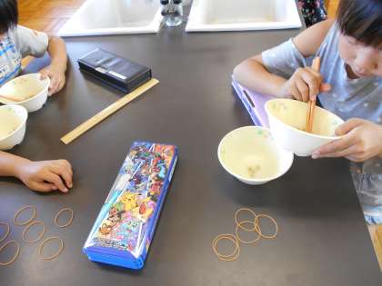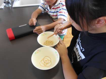 ☆今日は2年生の「おはし名人」授業がありました。まずはおはしで、お引越しゲームです。輪ゴムをお皿からお皿に一本ずつ、移動させます。みんな上手にできました。正しい使い方を復習して、大豆にチャレンジです。なかなか手ごわい様子ですが、こつをつかんで合格です!