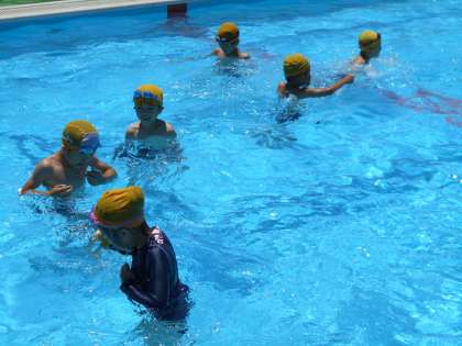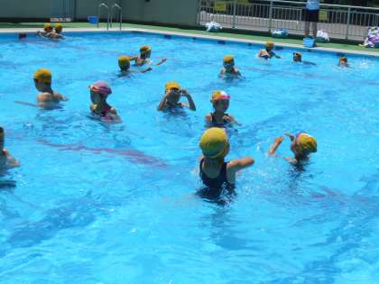 1年生は、小学校のプールに初めて入りました。2年生とはわかれて、小プールで水慣れです。2年生は、大プールに緊張しながら入っていました。