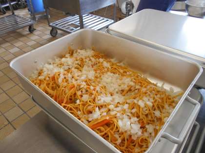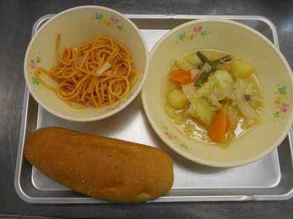 ※八王子ナポリタン「はちナポ」とは、・たっぷりの「きざみタマネギ」がのっていること!・八王子でとれた食材をつかっていること!八王子には大学が21校あり、学生が10万人います。「安くて、おなかいっぱい食べてもらいたい!」という思いで生まれたニューだそうです。給食では、八王子ナポリタンをパンにはさんで食べます!