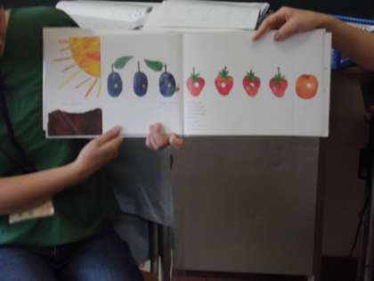 そして、「はらぺこあおむし」を1名が日本語、もう1名が英語で読み聞かせるという、とても珍しい読み聞かせをしていただきました。