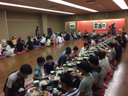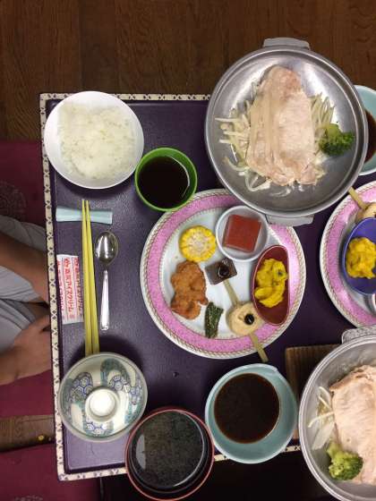夕食です。今日のメインは陶板焼きです。「いただきます」