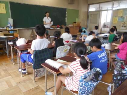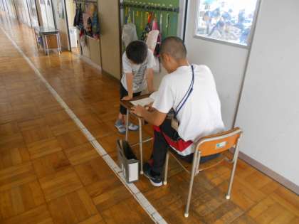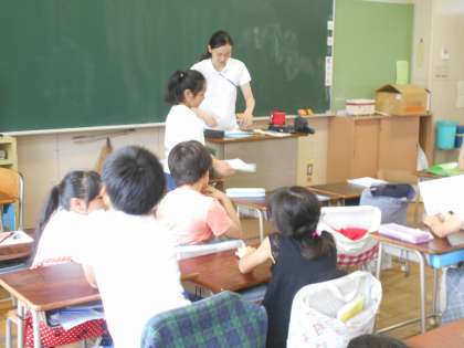 一人一人ががんばったことを伝えながら、通知表を渡しています。1学期に欠席がなかった人には、皆勤賞を渡しました。