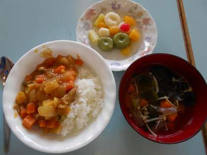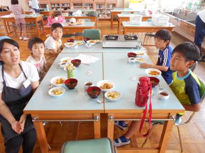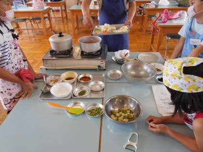 ※7月25日に3、4年生対象に夏休みこども料理教室を行いました。当日は暑い中たくさんの児童が参加し、給食で人気の料理に挑戦です。まずはお米をとぎ、野菜を洗い下処理です。みんなで交代に包丁を使い、ねこの手を学習です。スープは、昆布と削り節で出汁をとり、白玉フルーツは桑の葉粉入り団子と白の団子の2種類作りました。