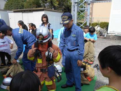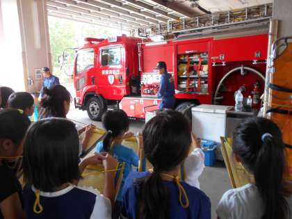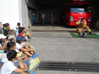 消防隊の出動訓練を見せていただいたり、消防車に積んでいる装備の説明をしていただいたり、防火服を着せていただいたりと教室での学習ではできない本物体験を、たっぷりとさせていただきました。消防についての質問もどれも的を射たものばかりで、充実のひと時でした。
