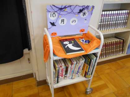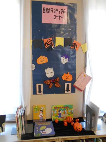 今日は10月の図書整備ボランティア活動日でした。図書室入口や室内のディスプレイをハロウィンの装飾にしていただきました。