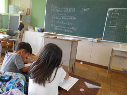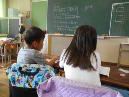 三角形と四角形の学習をしています。まとめの問題に取り組んでいたところ、自分の考えを確かめたくなったのでしょう。となりの友達に声をかけました。