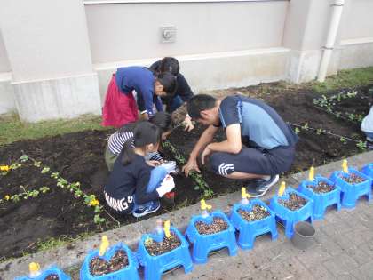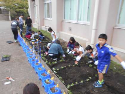 飼育栽培委員会で植えたい場所やデザインを決定し、花壇を耕したり土を準備したりしてくれました。その後、放課後子ども教室に集まった子供たちやお手伝いに来てくださった学校ボランティアのみなさんのお力をお借りして、一株一株ていねいに植えてくれました。花の苗の成長が楽しみです。