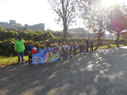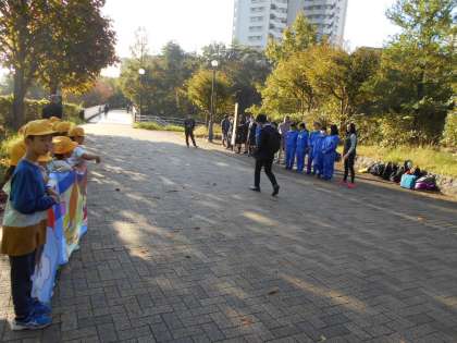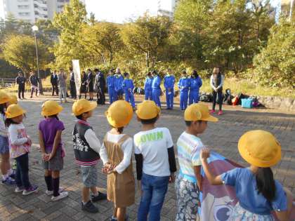 今月の当番は1年生でした。遊歩道を挟んで、中学生と一緒に地域の皆さんとあいさつを交わしました。