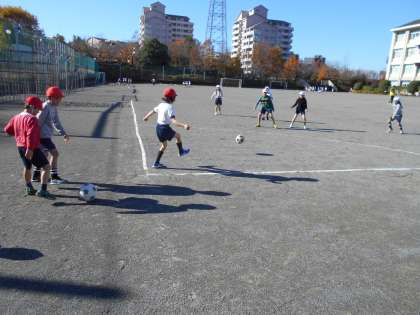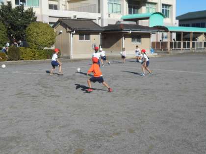 キックベースに取り組んでいます。コートは、野球と同じようにつくりますが、4つの塁を回るのではなく、今回は直線で走る距離で進んだ塁がわかるように工夫しました。