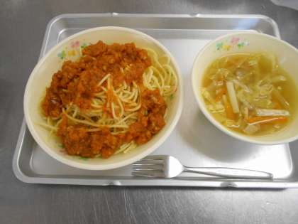 今日の昼食は、スパゲティミートソース ジュリエンヌスープ です。