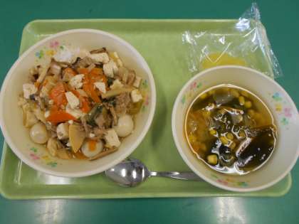 今日の献立は、ごはん、豆腐のうま煮、わかめとたまねぎのスープ、冷凍りんご、牛乳でした。