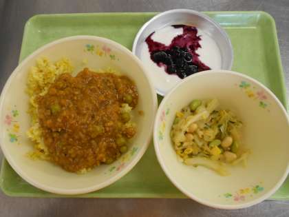 7月22日の給食 公開日 2020/07/22 更新日 2020/07/22 給食室から 今日の献立は、ドライカレー、まめサラダ、ヨーグルト・ブルーベリーソース、牛乳でした。 今日は八王子の恩方でとれたブルーベリーを使用しました。 給食