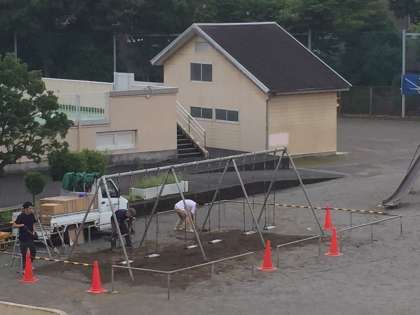 本体の交換とともに、掘れている地面を埋め戻して、衝撃緩和マットを敷きます。今日一日は工事で我慢。明日から新しいブランコで遊べます!