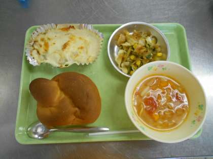 9月9日の給食 公開日 2020/09/09 更新日 2020/09/09 給食室から 今日の献立は、ミルクパン、マカロニグラタン、ミネストローネスープ、オニオンドレッシングサラダ、牛乳でした。グラタンは給食室で手作りしました。子供たちは数日前からとても楽しみにしていたので、喜んで食べていました。 給食