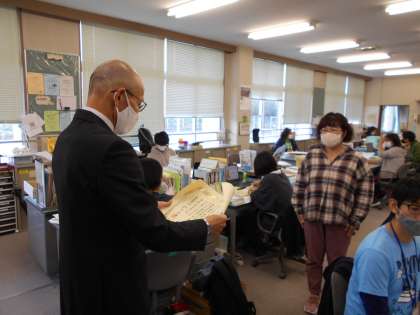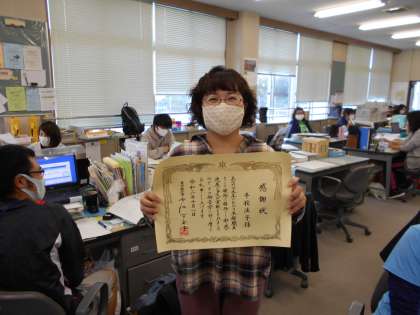 「いつもありがとうございます。」本日、本校の事務職員が25年勤続の表彰を受けました。校長先生から賞状が渡されました。これからも元気で学校のため、子供たちのためにお願いいたします。